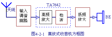 本站实验套件中有采用TA7642收音IC制作的简易收音机,是一款适合初学者装配学习的简易型收音机,其工作方式为直接放大式,它的工作方框图见图4-2-1。从天线接收进来的许多电台的高频信号,通过输入调谐回路选择,使得只有我们需要的那个台才能顺利进入下一级;由输入回路传输过来的高频信号是极其微弱的,还必须进行足够的放大,这叫高频放大,简称高放。高频信号放到足够大了,是不是就行了呢?也不行。下一步还要进行检波,检波的目的是把调制在高频载波上的低频信号取下来。检波后的信号同样是很微弱的,最后还要经低频放大再送到耳机还原成声音。