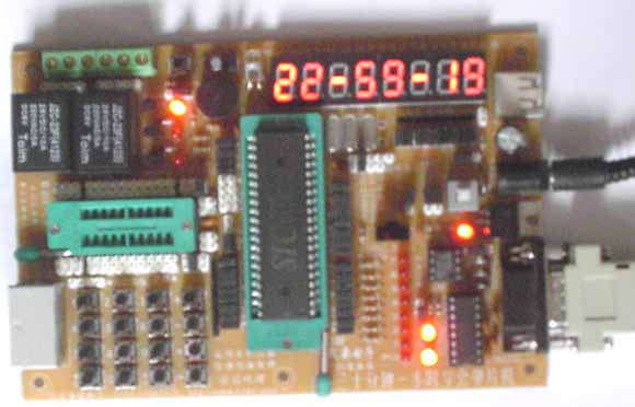 总之,即使不算本板的SIC编程功能,本板提供的硬件资源也比同类实验板要多得多!本板有现两路继电器(可分别直接控制家用电器等用)、声音(唱歌、报警、提示等用)、红外收(板上有红外接收头)、红外发(板上有红外发射)、通用输入、通用输出、高低电源选择(适用于不用芯片)、手动复位(做产品一般不需要,但实验板则最好有复位键,但是,很多板都偷工减料省掉)、电源开关等硬件资源等!拥有16个按键、8位数码显示、2路继电器的实验板并不多见。本板可以直接控制电灯、电器等。