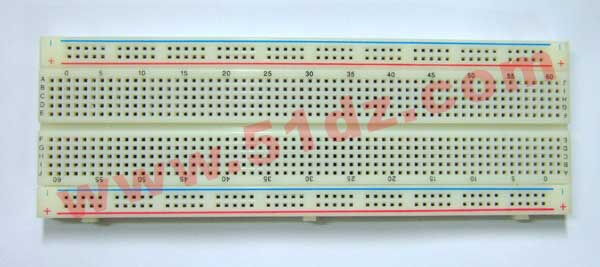 ●一个端子条,630个插孔 ●两个分配条,200个插孔 ●55×165×8.5 面包板又名万能实验板板,解决了广大电子爱好者的需求,面包板分上下两部分,上面部分一般是由一行或两行的插孔构成的窄条,行和行之间电气不连通。它由4行23列弹性接触簧片和ABS塑料槽板构成。在面包板上,标有A、B、C、D、E字母旁边的每竖列上有五个方孔,被其内部的一条金属簧片所接通,但竖列与竖列方孔之间是相互绝缘的。同理,标有F、G、H、I、J每竖列的五个方孔也是相通的。列和列之间以及凹槽上下部分则是不连通的。