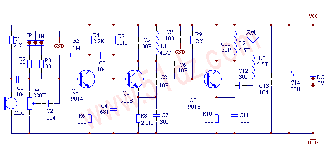 MIC先将自然界的声音信号变成音频电信号,经C2耦合给Q的基极进行调制,当有声音信号的时候,三极管的结电容会发生变化→振荡频率发生变化,完成频率调制,即调频。再经C6耦合给高频调谐放大电路对已调制的高频信号放大,再通过C12、L3和天线TX向外发射频率随声音信号变化而变化的高频电磁波。 其中R1为话筒MIC的偏置电阻,一般在2K—5.6K选取。R4为集电极电阻。R5为基极电阻,给Q1提供偏置电流。R6为发射极电阻,起稳定Q1直流工作点的作用;Q2、R7、R8、C4、C5、L1、C8、C7组成高频振荡电路,R7给Q2基极提供偏流,C5和L1振荡回路,改变其值可以改变发射频率,C8为反馈电容,R8起稳定Q2直流工作点作用,C7隔直流通交流电容;Q3、R9、R10、L2、C10、C11组成高频功率放大电路。R9给功率管Q3提供基极电流,C10和L2放大调谐回路,和振荡回路C5和L1调谐在同一频点时获得最大输出功率,发射距离最远。 我们将发射频率设计在FM收音机波段,因此可以配合任何FM收音机接收到该高频信号,并从该高频信号还原出声音信号,从而完成各种用途。