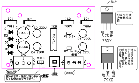 用户如果需要其它的电压输出,只需要更换三端稳压块就行了,例如需要正负9V的电压,将7912和7812换成7909和7809就可以了。