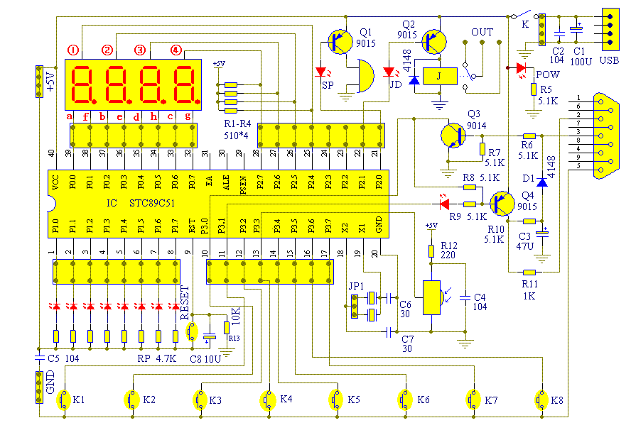 P0口一起给四个数码管提供笔画信号, P2.4,P2.5,P2.6,P2.7为位选通引脚;P2.0经发光二极管SP接到三极管Q1的基极,控制蜂鸣器发声;P2.1经JD发光管接到Q2控制继电器的吸合; +5V电经一个220Ω的限流电阻、C4滤波后给红外接收头供电,输出的信号输入到单片机芯片的P3.2口;JP1插针的作用是选择接到电路的晶振;P1口接8个LED,端口为高电平灯熄灭,为低电平点亮。可做流水灯实验等;P3口对地接8个按钮开关,用来对芯片输入数据或控制命令,其中P3.0和P3.1又分别接到由三极管Q3、Q4、R6、R7、R8、R9、R10、R11组成和MAX232一样功能的通讯电路和电脑连接通信。本板5V工作电压直接从USB接口取电。