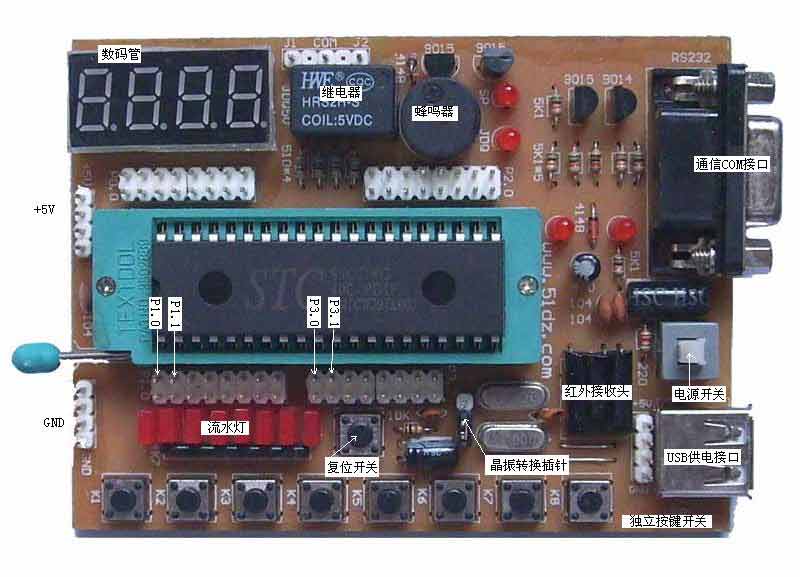 学单片机是一项非常重视动手实践的,不能总是看书,但是学习它首先必须得看书,因为从书中你需要大概了解一下,单片机的各个功能寄存器,说明白点,我们使用单片机就是用软件去控制单片机的各个功能寄存器,再说明白点,就是控制单片机那些管角的电平什么时候输出高,什么时候输出低。而由这些高低电平的变化来控制由单片机为核心的系统板。从而实现我们需要的各个功能。对于看书,我们只需大概看看了解一个单片机各个管脚都是干什么的?都有什么样的功能,能实现什么样的功能?其实第一次,第二次你可能都看不明白,但这不要紧,因为你没有和实际的物体建立起来这样一种互通的观念,所以我总是说,学单片机看书看两三天的时间就够了,看小说你一天能看五六本,看单片机你两三天看两三边就够了,而且可以不用很仔细的看。大概了解一下书上的内容后,就开始做实践,这是非常关键的,如果说学单片机你不做实践那是不可能学会的,关于做实践有两种方法你可以选择,一种方法:你自己花钱买一块单片机的学习板,不要求功能太全的,对于初学者来说你买功能非常多的那种板子,上面有很多东西你这辈子都用不着,我建议有流水灯,有数码管,有按键,有蜂鸣器,这就差不多了,如果上面我提到的这些东西你能让它都熟练工作了,那可以说对于单片机方面的硬件你已经入门了,再剩下的就是自己练习设计其它电路,这需要你练习,不断的积累经验,只要过了第一关,后面的路就好走多了,万事开头难,大家可能都听过。本板仅提供给大家自由发挥,本站还有还有其它两款实验板可供大家选用