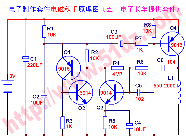 本电路中,R7也有一定的作用,它可以限制Q4的基极电流不要太大,同时延长Q4给线圈的供电时间,这适合机械结构比较差的电磁秋千,因此,本电磁秋千电路适合绝大多数高速的、低速的、大线圈的、小线圈的、大体积的、小体积的各种各样的电磁秋千应用!本电路设计版权所有,禁止竟争对手仿制!请注意:电磁秋千最终能否制作成功,某种程度上还取决于用户的机械装置!如果用户的机械装置不合理,那也可能不成功。但是,机械的问题毕竟比较简单,是眼睛看得见的问题,是用手就模得着的问题,本站不加以深入讨论,本站的电磁秋千套件,会提供一个简易的机械装置,确保用户的秋千绝对能荡起来!(再请注意:本秋千在启动时必须先人为的启动,如果秋千速度太低,或者磁铁距离线圈太远,导致L1连几毫伏的电信号也无法产生,本秋千就不会荡起来。)