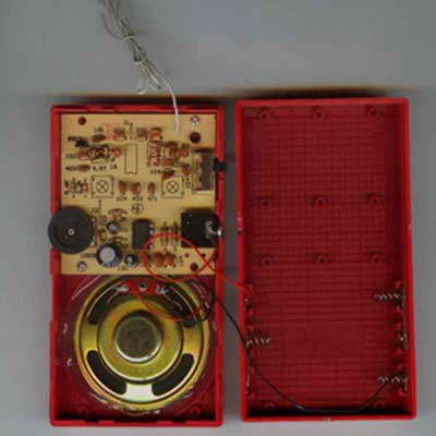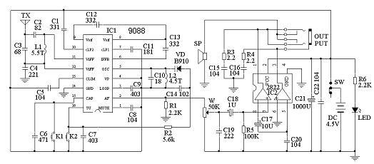 2脚输出的音频信号经电位器W调节音量后送入功放IC 2822的7脚,经功率放大后从1、3脚输出推动耳机发声。功放2822我们这里采用桥式接法,功率更大,1、3脚输出不用电容直接接到喇叭,一定程度上改变中低音效果。