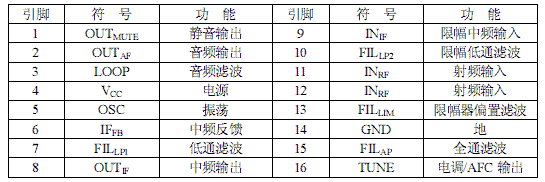 调频收音机具有灵敏度高、选择性好、通频带宽、音质好等特点。采用CD9088调频专用集成电路来制作电调谐调频收音机,具有电路简单、制作容易、调试方便、性能价格比高、音质好、成本低、体积小等特点。CD9088采用16脚双列扁平封装,可直接焊接在印刷电路板上,其工作电压范围为1.8~5V,典型值为3V。该电路内含调频收音机从天线接收到鉴频级输出音频信号的全部功能,并设有搜索调谐电路,信号检测电路,静噪电路,以及频率锁定环(FLL)电路等。其特点是采用70KHZ中频频率,不设置外围中频变压器,中频选择性由RC中频滤波器来完成,简化了电路、省去了中频频率调试的麻烦,又提高了中频频率特性,并减少了电路体积。用CD9088可组成各种调频收音机电路,除可采用电调谐方式来搜索电台外,也可采用传统的可变电容器调谐搜索电台。CD9088集成电路各引脚的功能如下表: