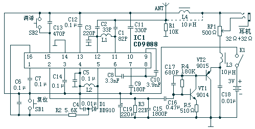 FM信号由天线引进后从CD9088集成块11脚进入混频电路,电感L1、电阻R1、电容C1、C2、C3构成输入回路,本振电路的本振频率由L2、C4及变容二极管D1决定。C7为音频静噪电容,C8为中频反馈电容,C9为低通滤波器电容,C10为中频级耦合电容,15脚为搜索调谐端,16脚为电调谐AFC电压输出端,SB1为复位按钮,SB2为调谐按钮。按一下SB2按钮收音机就会自动从频率低端向频率高端选台,当收到一个电台时,便自动锁定电台停止搜索,如要收听下一个电台节目,可再按一下SB2按钮顺序搜索电台。当搜索到频率最高端时,按一下SB1按钮即可回到频率最低端,然再重新选台。