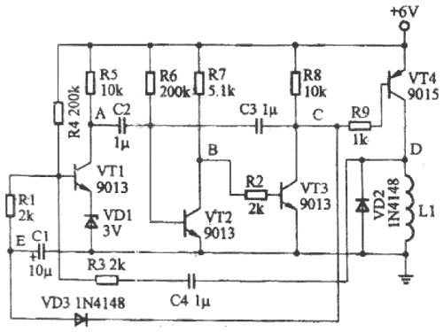 图中用了4只三极管,VT1处于放大状态,VT2处于饱和状态,VT3、VT4绝大部分时间处于截止状态。