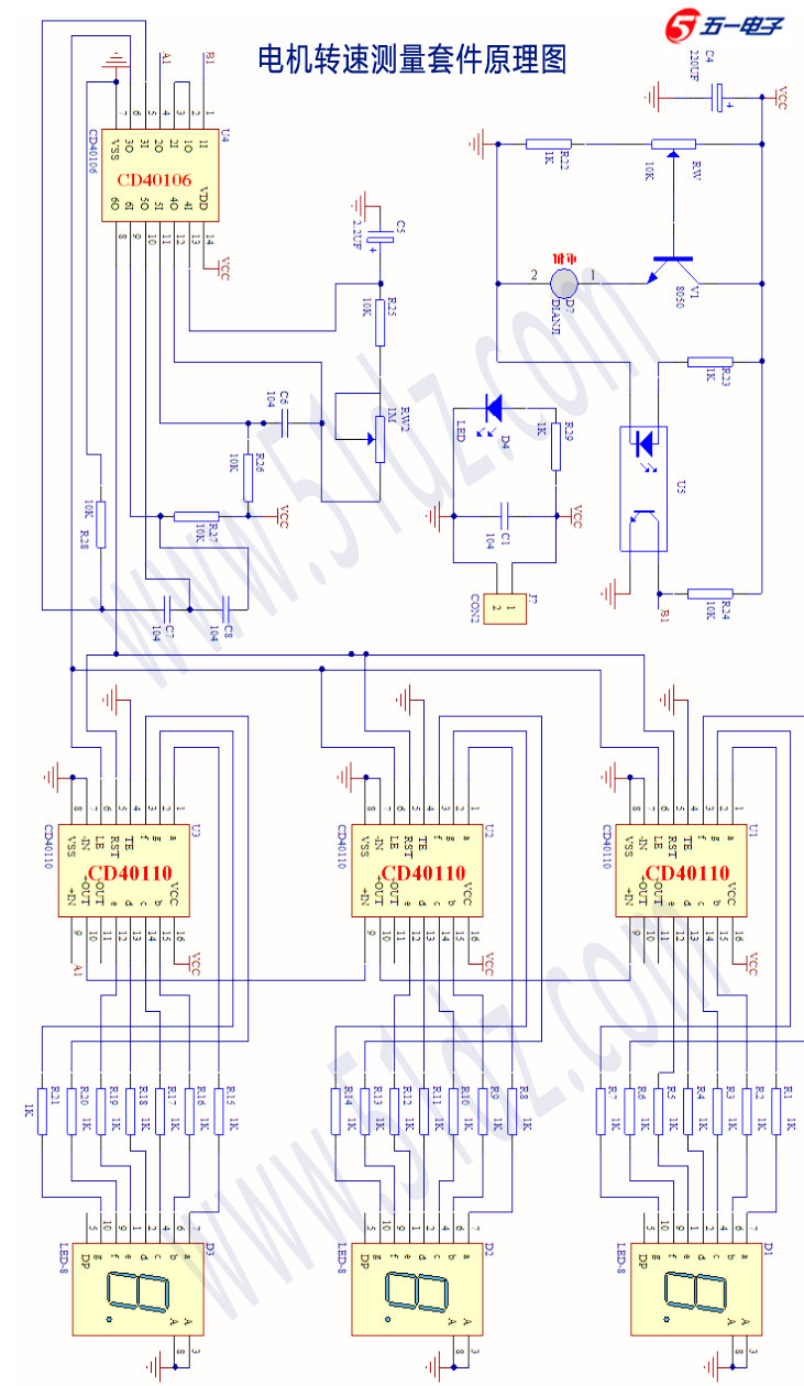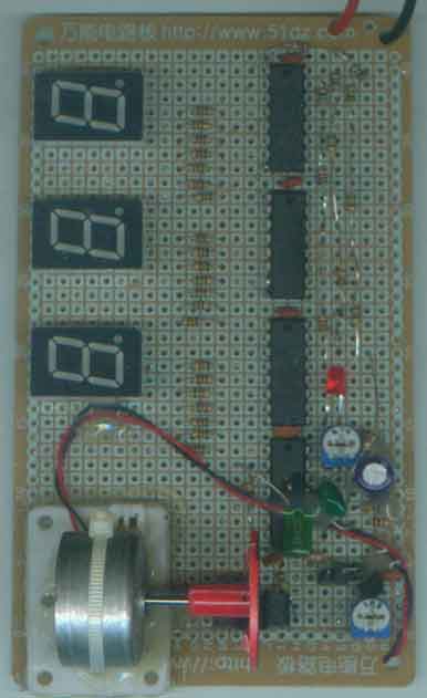 安装好后,调节W 1M的阻值,使振荡周期在1秒。本套件赠送有电动机、转盘透光孔、红外光电传感器,按原理图安装后,调节W10K可以改变电机的转速,让电机带动转盘透光孔经过红外光电传感器中央,这样就可以检测并显示电机转速,如果要想到电机每分钟的转速,可以将振荡周期调为60秒(需要将C5加大到100UF以上后再调R28),同时千位数用人工计数,当然,也可以用电机的每秒转速乘以60,或者每6秒的转速乘以10。