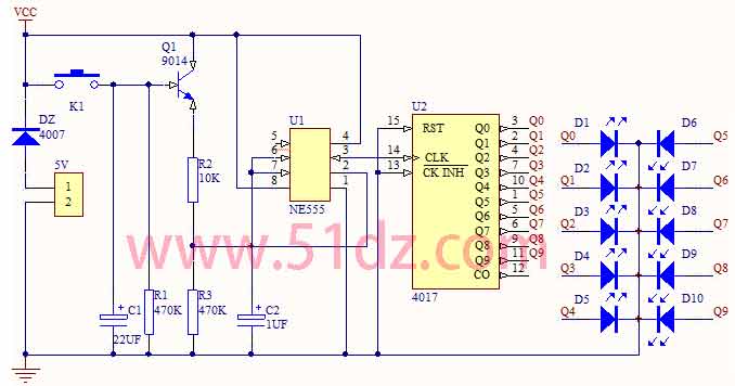 贴片流水灯套件: 本电路主要由脉冲产生器和一个十进制计数器CD4017电路组成。脉冲产生器由NE555及外围元件构成多谐振荡器,当按下按键K1时Q1导通,NE555的3脚输出脉冲,则CD4017的10个输出端轮流输出高电平驱动10只LED轮流发光。松开按键后,由于有电容C1的存在,Q1不会立即截止,随着C1两端电压的下降,Q1的导通程序逐渐减弱,3脚输出脉冲的频率变慢,LED移动频率也随之变慢。最后当C1放电结束后。Q1截止,NE555的3脚不再输出脉冲,LED停止移动。