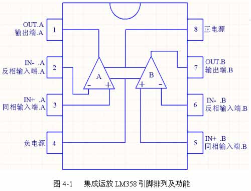 任务一 理解集成运放电路的工作原理 运算放大器是一个具有高放大倍数的放大器,当它与外部电阻、电容等构成闭环电路后,就可以组成种类繁多的应用电路。在运算放大器线性应用中,可构成:反相比例运算、同相比例运算、反相求和运算、加减混合运算等。图4-2电路就是一个可完成上述运算功能的组合测试电路。 本电路采用的是LM358为8脚集成双运放芯片,其引脚排列级功能如图4-1所示。注意LM358所用直流电源为±12V。