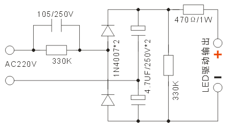 附:116灯LED串联供电的电源的电路原理图(以下元件参数在230V时,经过实测(安装本站的白光草帽灯)LED工作电流11MA,LED两端工作电压2.85V,整灯耗电量约为4W左右,实际照明效果的亮度相当60W白炽灯泡,接近20W日光灯的亮度。)