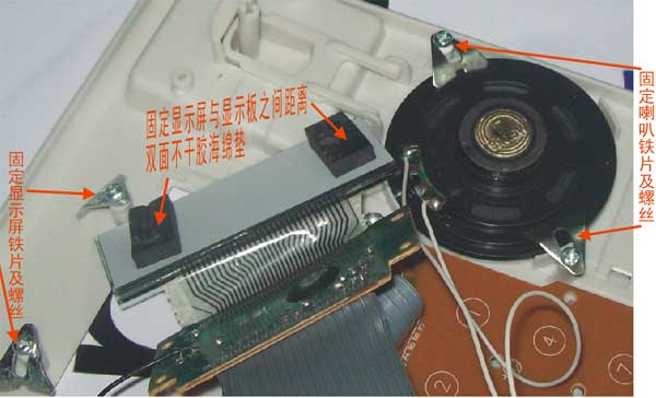 6)给液晶显示屏撕掉保护膜,给双面胶撕掉保护层,贴到显示屏上,然后把液晶显示屏放到面壳上,使其紧贴到位后再用板对齐螺丝孔,轻轻压下去,让双面胶紧贴在液晶显示屏和控制板之间,打好螺丝。注意显示屏的板一边是用铁片定位的,跟喇叭的铁片一样。