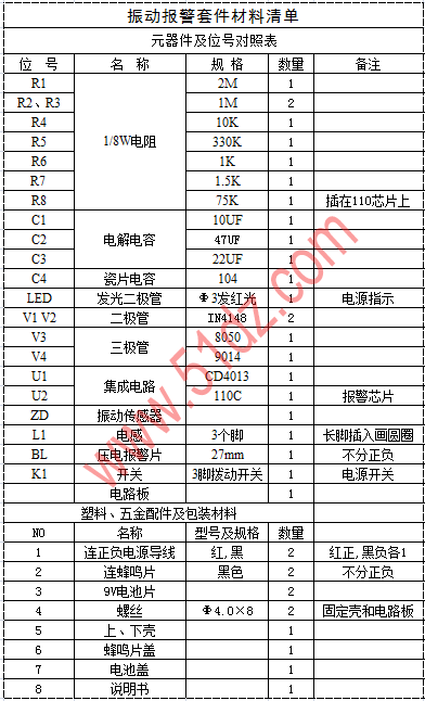 震动报警套件又名振动报警套件:本产品具有自动防盗报警,自动关门延时。适用于家庭门、窗、器具、办公用品等的防盗报警。