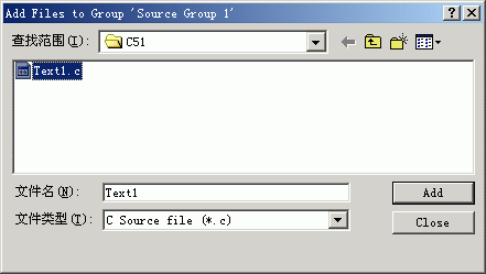 选中Test.c,然后单击“Add ”屏幕好下图所示  注意到“Source Group 1”文件夹中多了一个子项“Text1.c”了吗?子项的多少与所增加的源程序的多少相同